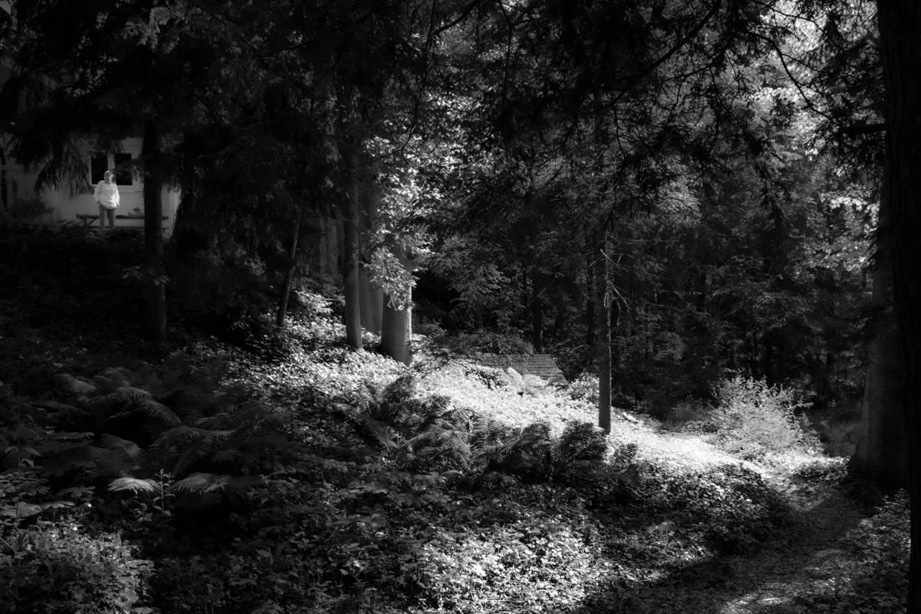The Waiting Woods. On this little hillside, a person is readying for a walk from a house down the wooded slope. The light is dramatic and makes the woods a little scary in the darker parts. But a path is well-lit, at least in some places. What are you waiting for? All to be revealed?