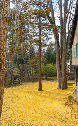The Gingko Lets Down Her Skirts. A friend contacted me to let me know that the gingko tree at Thunderbird Lodge had dropped its leaves. I arrived to find this enchanting golden carpet over the entire area around the tree. I do not know how old the tree is or who planted it, but judging by its size it is many decades old. One can not only delight in the beauty of its fallen foliage but also stand in awe that gingko trees are living fossils that have been around since the Jurassic.