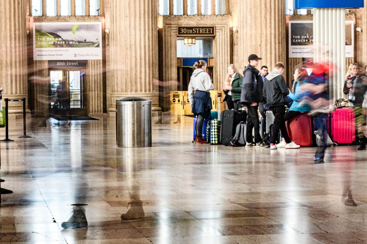 This approach can have odd effects. For example, in this 1-second exposure in a train station, parts of some walking people are blurred out to the point they disappear, leaving disembodied feet and vague wavy lines in the image. On second thought, not just odd, also kind of fun.