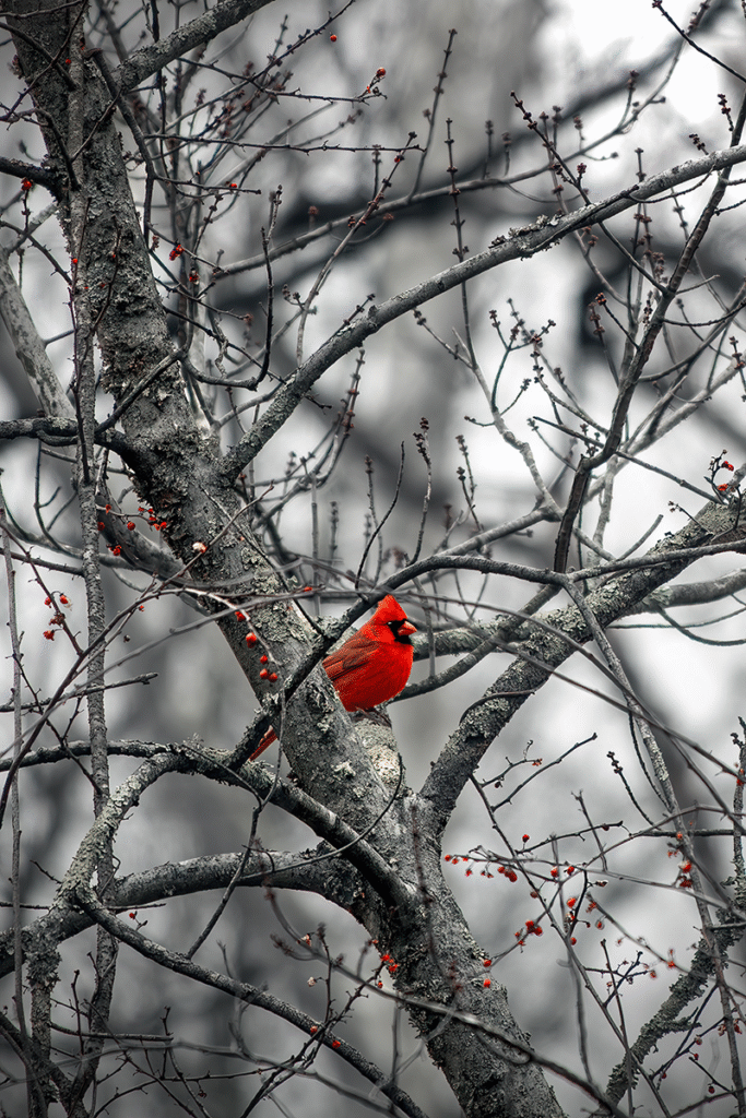 A cardinal among winterberries complements the scene beautifully, while a turkey vulture against bare branches provides dramatic contrast. Even without bold color, the dynamic lines and angles of the branches can stand on their own as a work of art.