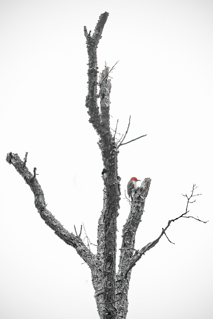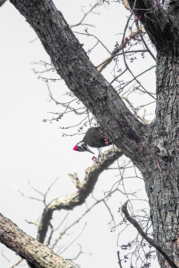 The bright red crown of a pileated or red-bellied woodpecker can add a powerful pop of color against the muted tones of leafless trees. Some of my favorite prints come from draining much of the brown from the trees in post-processing, creating color splash effects uncommon in bird photography.